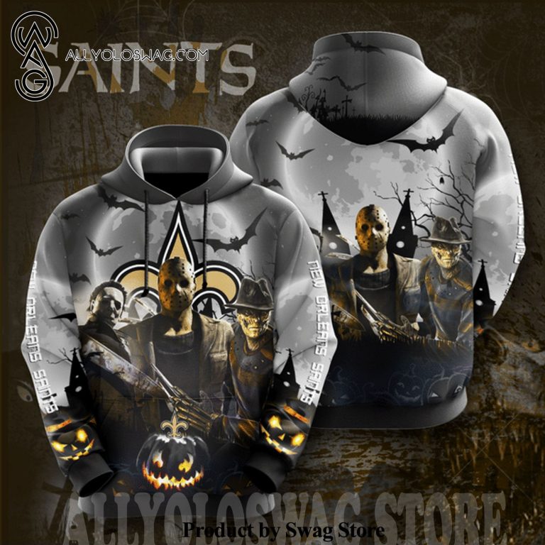NOTE: [Top-selling] New Orleans Saints Football Team Freddy Krueger Michael MyersJason Voorhees Halloween Full Printing Hoodie – Black