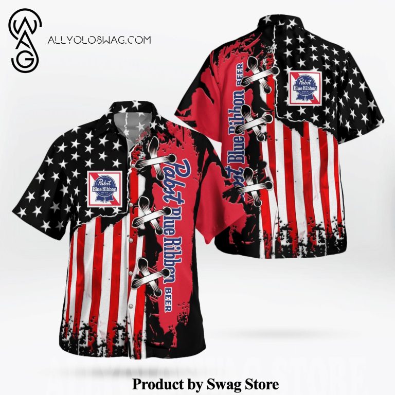 Hawaiian Shirt [Top-selling] Pabst Blue Ribbon All Over Print Hawaiian Shirt – American Flag Color