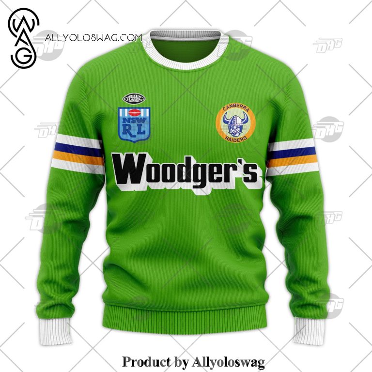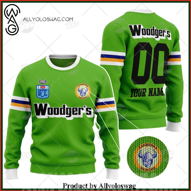 NOTE: [Top-selling] Personalized Canberra Raiders 1989 Woodgers ARL NRL Vintage Retro Heritage Ugly Christmas Sweater