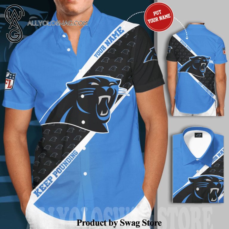 Some details about our product [Top-selling] Personalized Carolina Panthers All Over Print Short Sleeve Dress Shirt Hawaiian Summer Aloha Beach Shirt – Light Blue Black