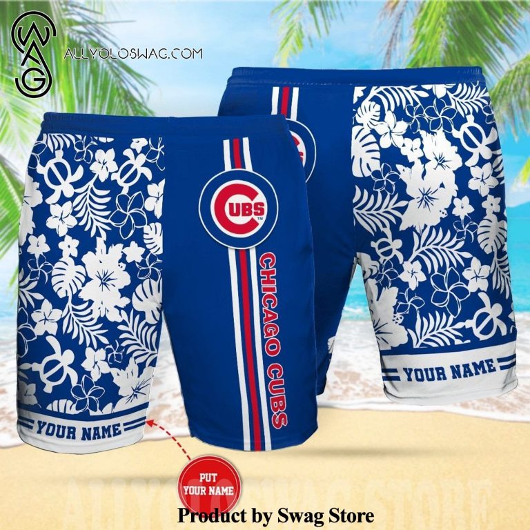 Hawaiian Shirt [Top-selling] Personalized Chicago Cubs All Over Print Flowery Aloha Summer Hawaiian Beach Shorts – Cobalt