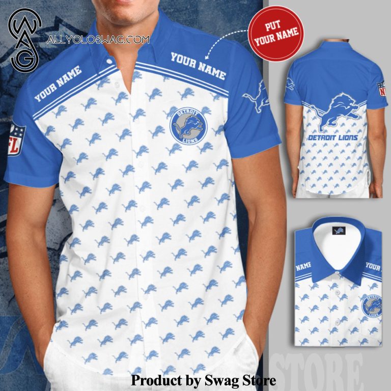 Some details about our product [Top-selling] Personalized Detroit Lions Logo All Over Print Short Sleeve Dress Shirt Hawaiian Summer Aloha Beach Shirt – White Light Blue