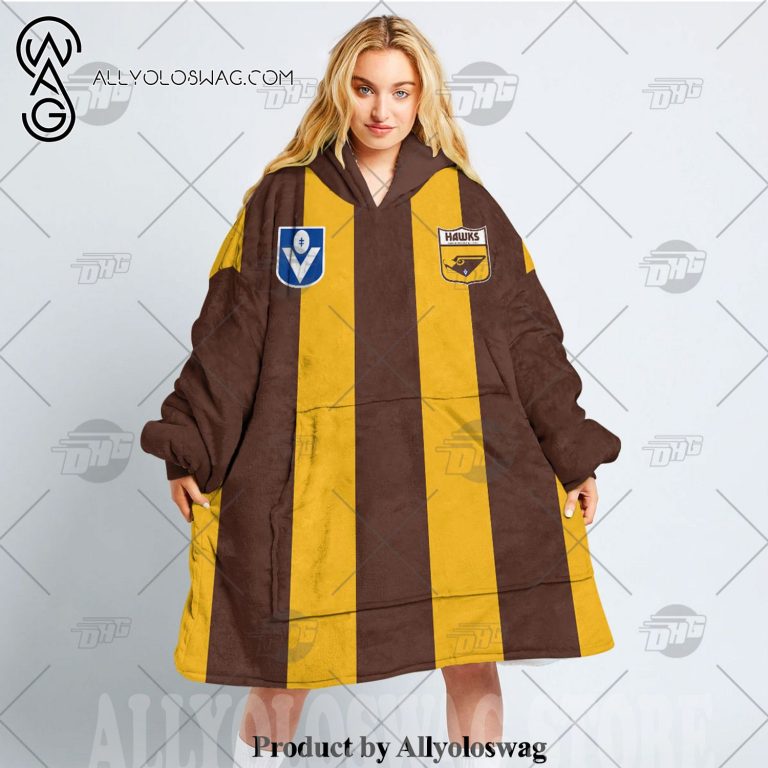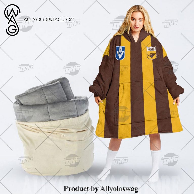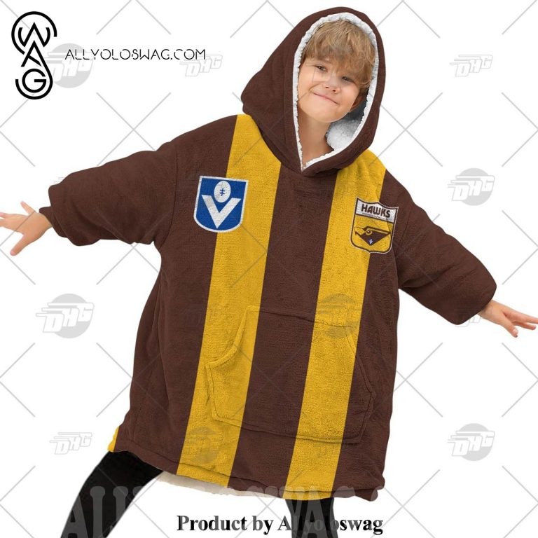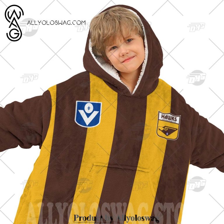 Best hoodies with blankets for hibernating in winter [Top-selling] Personalized Hawthorn Football Club Vintage Retro AFL Guernsey 90s Hoodie Blanket
