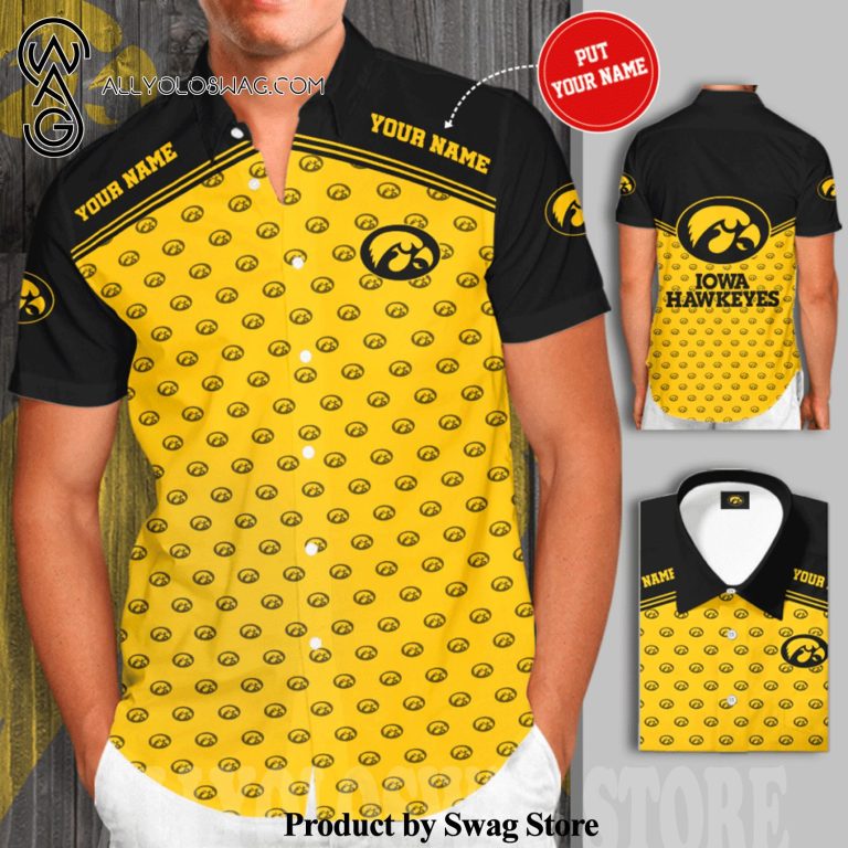 Some details about our product [Top-selling] Personalized Iowa Hawkeyes All Over Print Short Sleeve Dress Shirt Hawaiian Summer Aloha Beach Shirt – Yellow Black