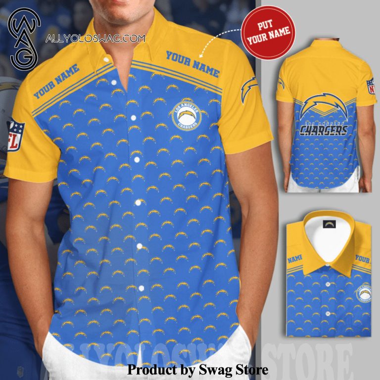 Hawaiian Shirt [Top-selling] Personalized Los Angeles Chargers Logo All Over Print Short Sleeve Dress Shirt Hawaiian Summer Aloha Beach Shirt – Blue Yellow