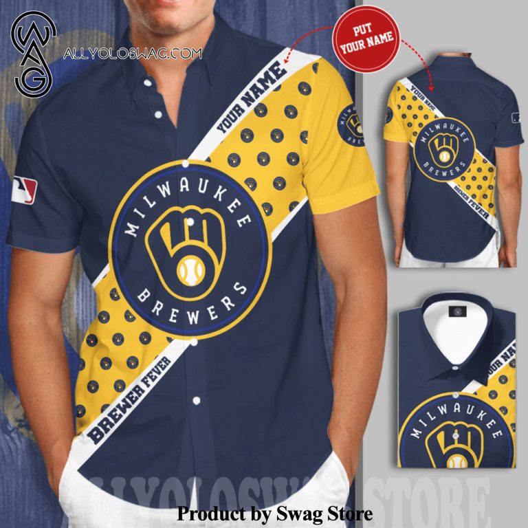 Some details about our product [Top-selling] Personalized Milwaukee Brewers All Over Print Short Sleeve Dress Shirt Hawaiian Summer Aloha Beach Shirt – Cobalt Yellow