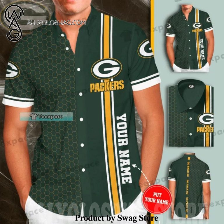 [Top-selling] Personalized Packers Hexagonal And Yellow Striped Summer Set Hawaiian Shirt was hand-tailored in the early days of fashion. This might happen in the comfort of one’s own home or at a custom tailor’s business. These stores immediately sprang up all across the islands, especially in plantation towns and Honolulu. Newly accessible fabrics from throughout the world were sold at dry goods stores, including printed silk from Japan, raw silk, batik, and rayon from the United States mainland, and cotton cloth for kimonos and yukatas.Hawaiian history had long been shaped by Asian immigrants, and apparel designs reflected this. Short- and long-sleeved shirts, as well as women’s skirts, were created using pre-printed textiles from China and Japan and were based on Asian clothing styles. These bright blouses and dresses were the forerunners of today’s Aloha attire. On the islands, we say “ono” to describe something that is pleasantly cool.