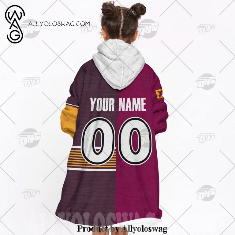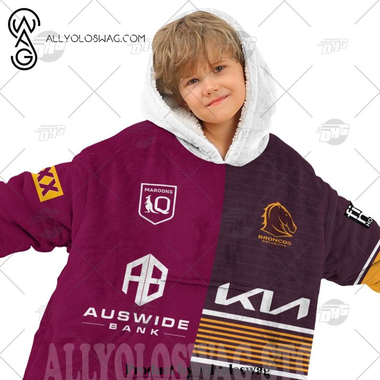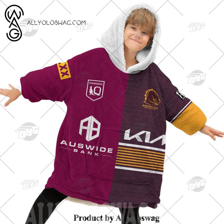 Note: [Top-selling] Personalized QLD Maroons To NRL Brisbane Broncos Half and Half Split Jersey Hoodie Blanket