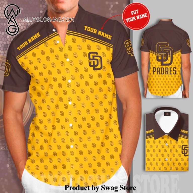 Hawaiian Shirt [Top-selling] Personalized San Diego Padres Logo All Over Print Short Sleeve Dress Shirt Hawaiian Summer Aloha Beach Shirt – Yellow Brown