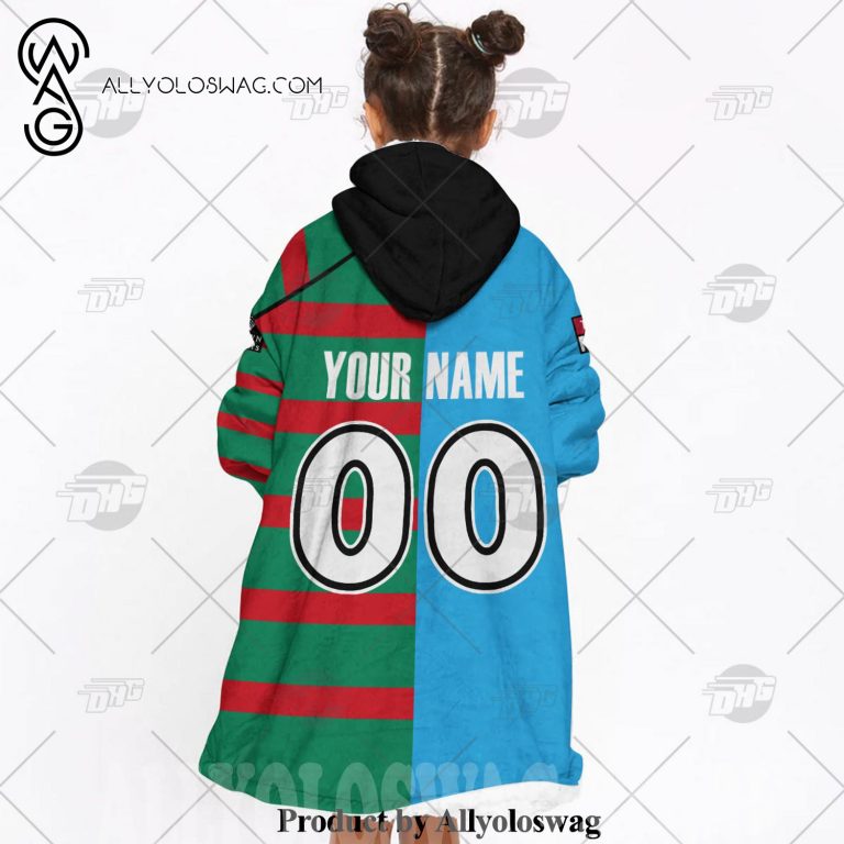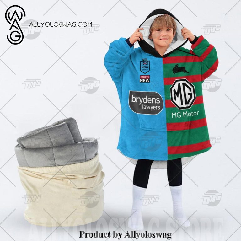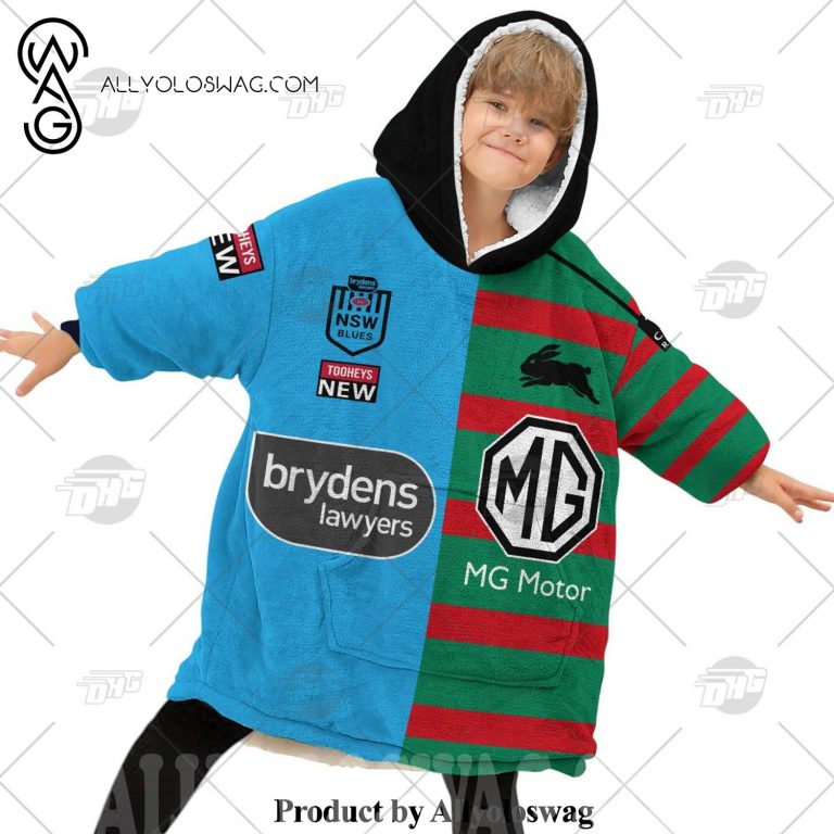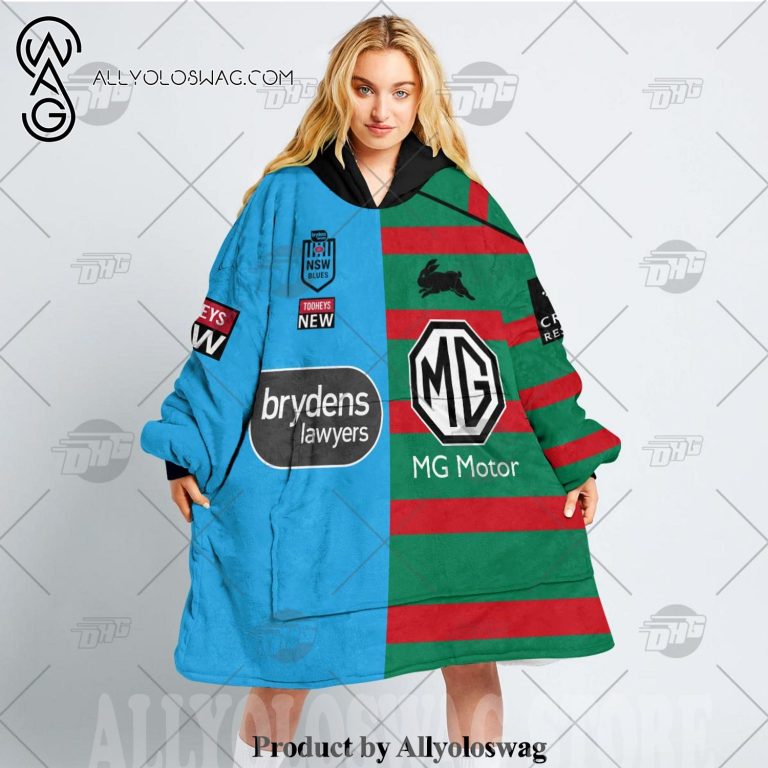 Best hoodies with blankets for hibernating in winter [Top-selling] Personalized SOO NSW Blues To NRL South Sydney Rabbitohs Half and Half Split Jersey Hoodie Blanket