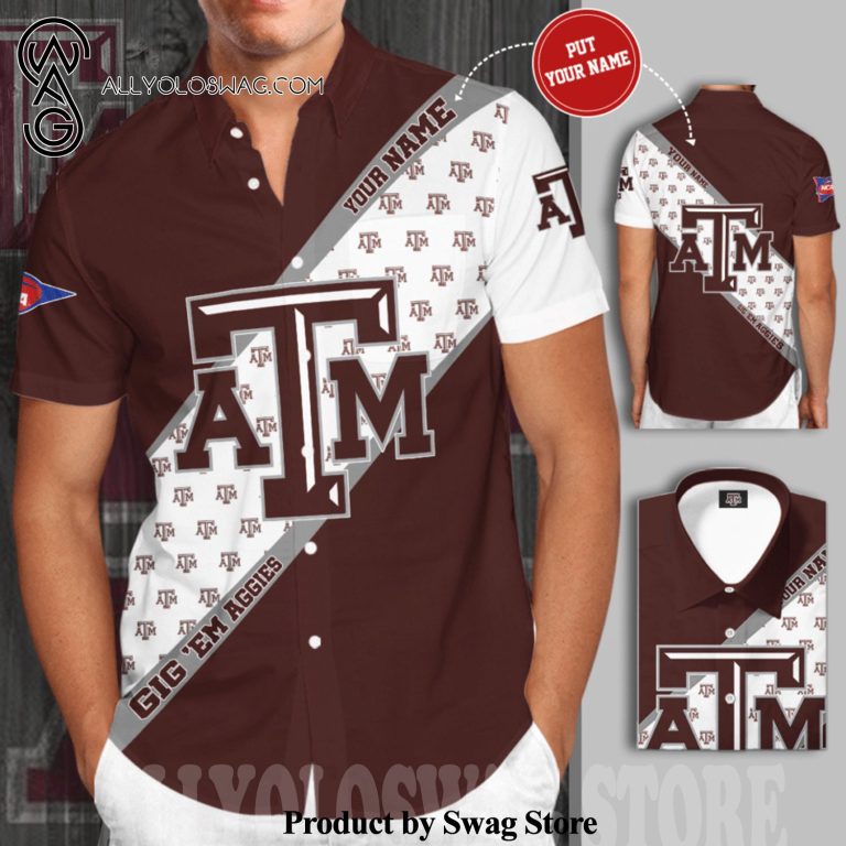 Hawaiian Shirt [Top-selling] Personalized Texas A&M Aggies Big Logo Gig ‘Em Aggies All Over Print Short Sleeve Dress Shirt Hawaiian Summer Aloha Beach Shirt – Brown White