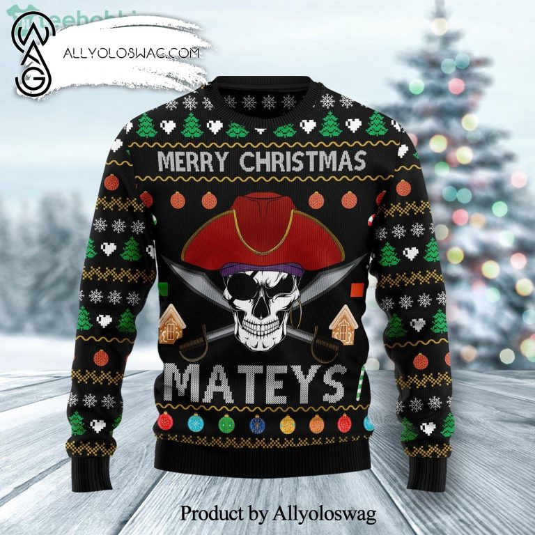 NOTE: [Top-selling] Pirate Skull Merry Christmas Mateys Knitted Ugly Christmas Sweater