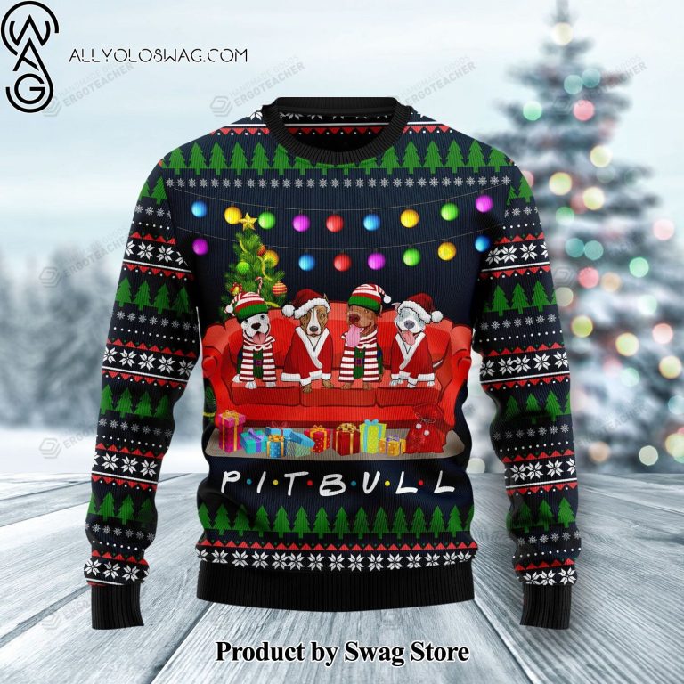 Some details about our [Top-selling] Pit Bull Friends On Red Sofa Christmas Ugly Christmas Holiday Sweater