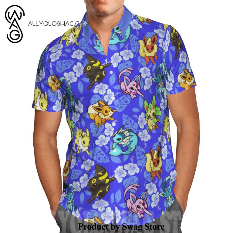 Some details about our product [Top-selling] Pokemon Eevee Evolution Tropical Hibiscus All Over Print Hawaiian Shirt – Blue