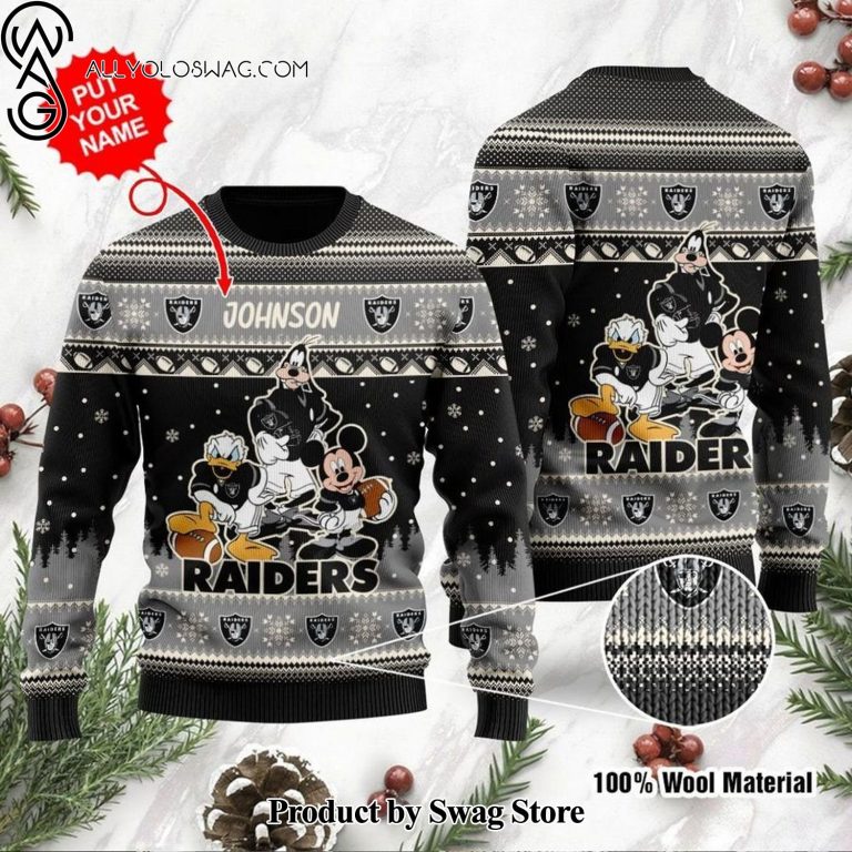 NOTE: [Top-selling] Raiders Disney Donald Duck Mickey Mouse Goofy NFL Personalized Christmas Ugly Christmas Sweater