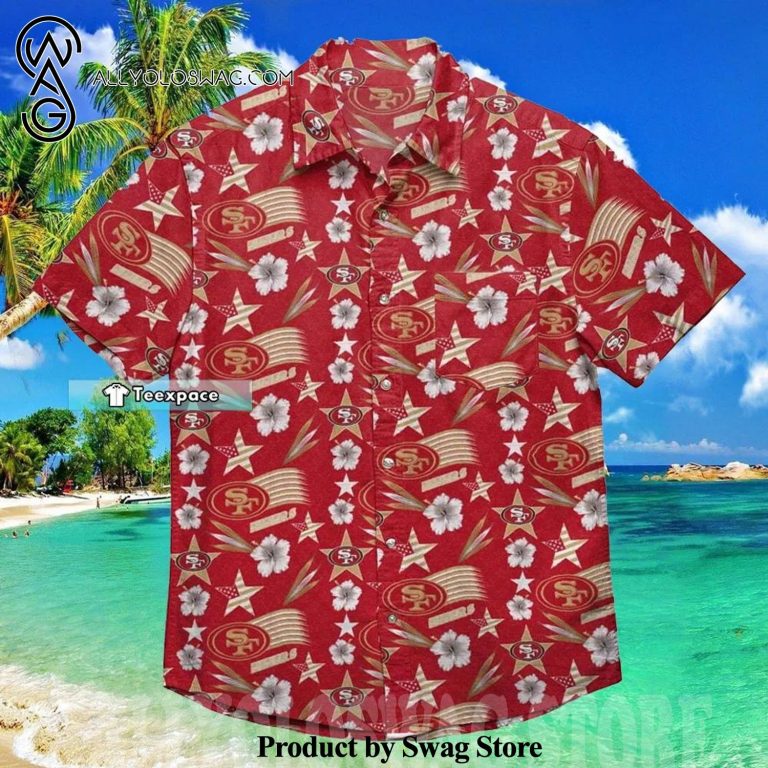 [Top-selling] San Francisco 49ers American Flag Summer Set Hawaiian Shirt was hand-tailored in the early days of fashion. This might happen in the comfort of one’s own home or at a custom tailor’s business. These stores immediately sprang up all across the islands, especially in plantation towns and Honolulu. Newly accessible fabrics from throughout the world were sold at dry goods stores, including printed silk from Japan, raw silk, batik, and rayon from the United States mainland, and cotton cloth for kimonos and yukatas.Hawaiian history had long been shaped by Asian immigrants, and apparel designs reflected this. Short- and long-sleeved shirts, as well as women’s skirts, were created using pre-printed textiles from China and Japan and were based on Asian clothing styles. These bright blouses and dresses were the forerunners of today’s Aloha attire. On the islands, we say “ono” to describe something that is pleasantly cool.