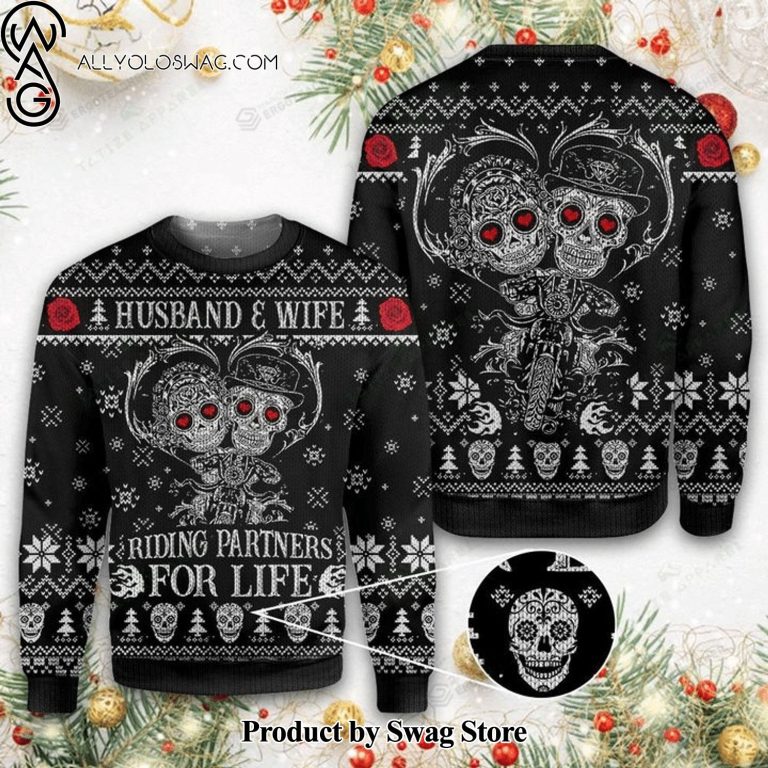 NOTE: [Top-selling] Skull Husband Wife Riding Partners For Life Knitting Pattern Ugly Christmas Sweater