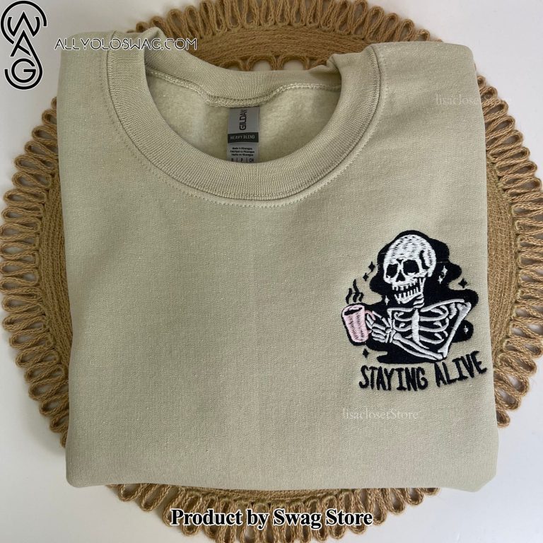 NOTE: [Top-selling] Staying Alive Skeleton Coffee Embroidered Sweatshirt, Halloween Shirt, Fall Sweatshirt, Halloween Embroidered