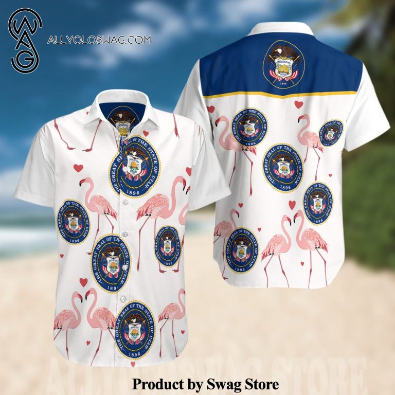 Hawaiian Shirt [Top-selling] Utah State Flamingo All Over Print Summer Short Sleeve Hawaiian Beach Shirt – White