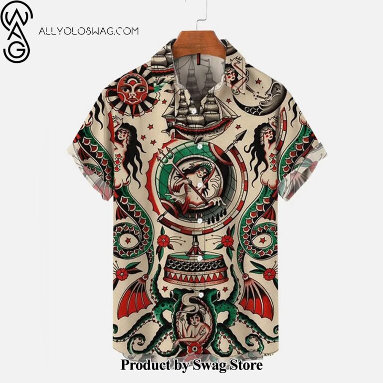 NOTE: [Top-selling] Vintage Sailing Ship Mermaid And Globe Tattoos Casual Short Sleeve Shirt Pop Culture Hawaiian Shirt
