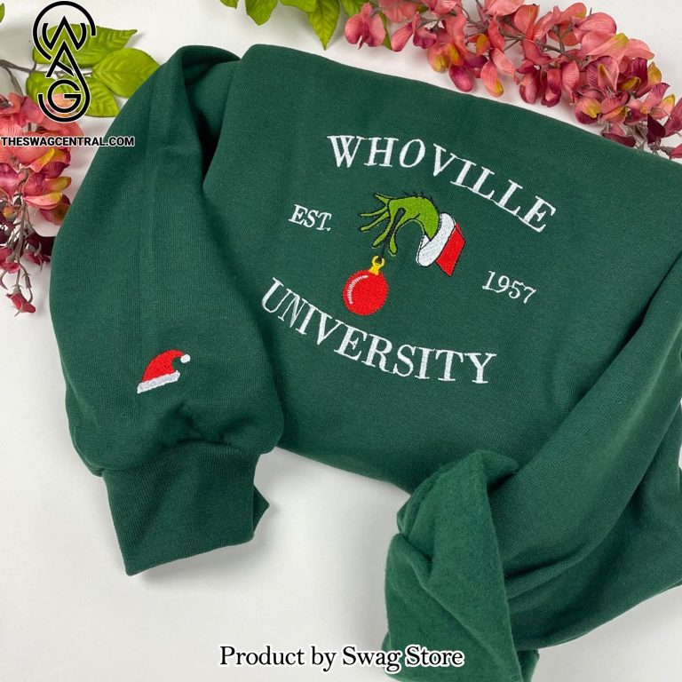 NOTE: [Top-selling] Whoville University Grinch Hand Santa Hat Embroidered Sweatshirt Christmas Xmas